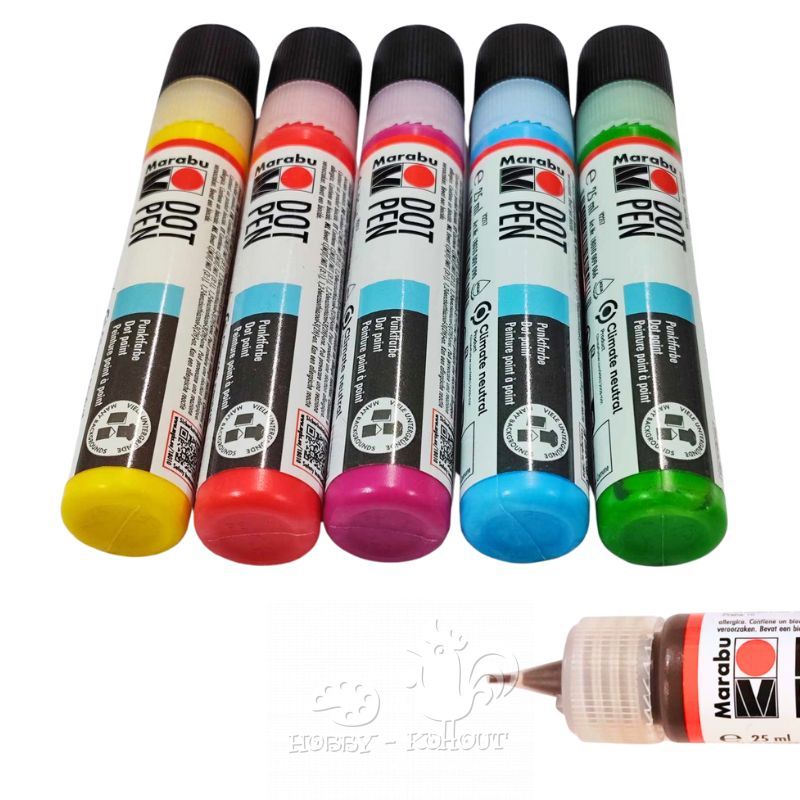 Barva DOT PEN je univerzální barva na malování nebo tečkování. Můžete je použít na různé podklady i na látky s příměsí syntetiky do 20% podílu. Barvy jsou na vodní bázi, klimaneutrální a 100% veganské. Barvy jsou po zaschnutí matné. Můžete malovat na kameny, tmavý i světlý textil, malířské plátno, dřevo, keramické odlitky, sádru, kov atd. Doporučujeme také na tečkování na kameny.
