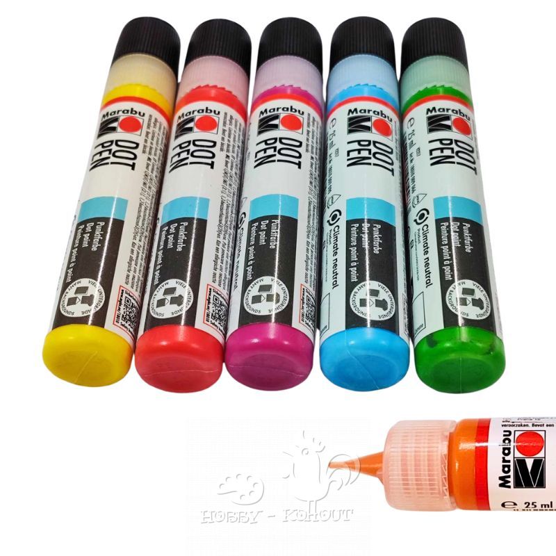 Barva DOT PEN je univerzální barva na malování nebo tečkování. Můžete je použít na různé podklady i na látky s příměsí syntetiky do 20% podílu. Barvy jsou na vodní bázi, klimaneutrální a 100% veganské. Barvy jsou po zaschnutí matné. Můžete malovat na kameny, tmavý i světlý textil, malířské plátno, dřevo, keramické odlitky, sádru, kov atd. Doporučujeme také na tečkování na kameny.