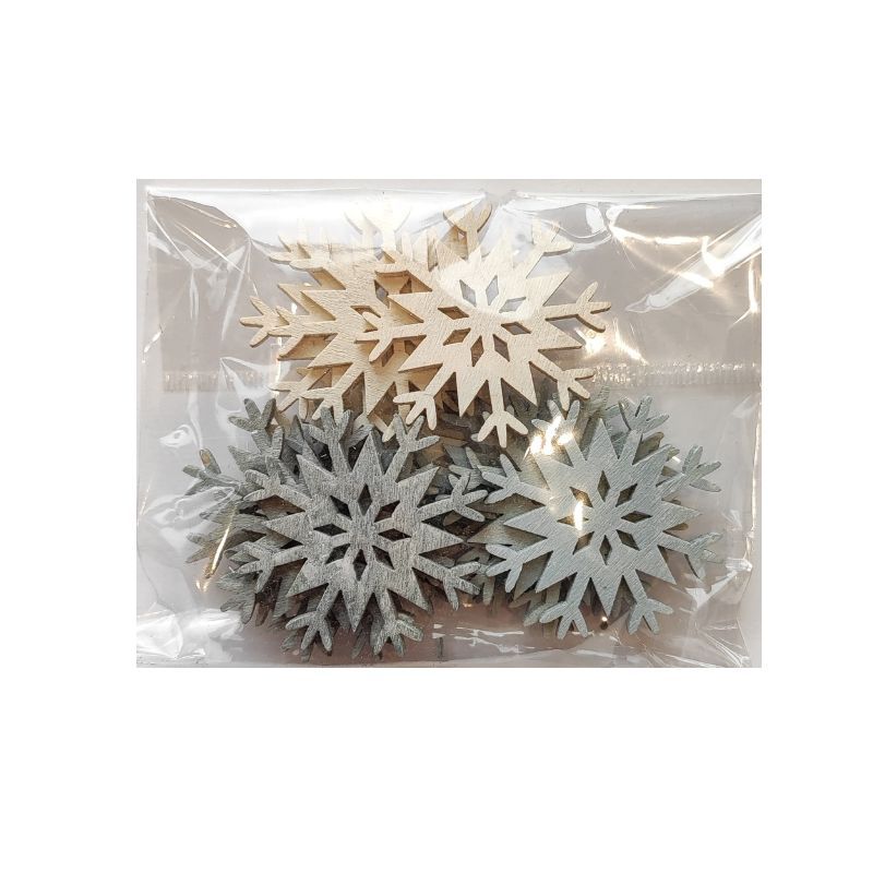 Dřevěné dekorace vločky o velikosti 4 cm, balení 12 ks. Můžete použít jako drobnou vánoční dekoraci na dárkové tašky, na další tvoření, aranžování nebo zdobení adventních věnců.