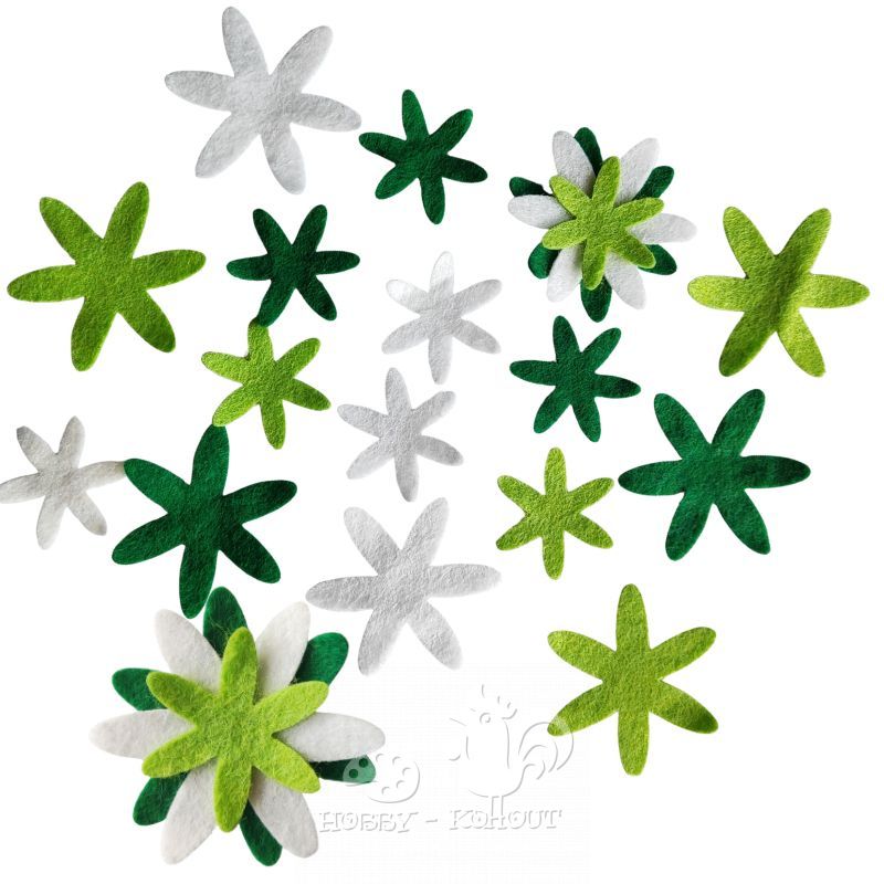 Sada výřezů z filcu pro výrobu dekorací. Obsahuje celkem 18 ks výřezů (9 větších a 9 menších), velikosti kytiček z filcu 5,5 cm a 3,5 cm, tloušťka filcu 1 mm. Balení je laděno ve třech barvách vhodných na kombinování. Vždy obsahuje světlou, střední a tmavší barvu - viz ukázka.