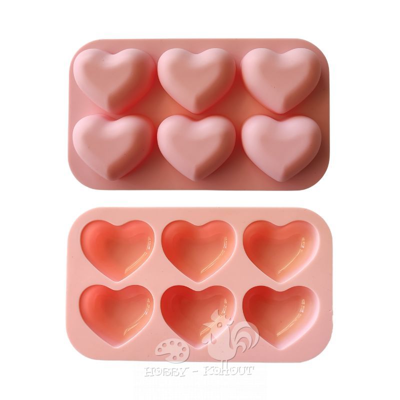 Silikonová forma na odlitky z keramických hmot, mýdlové hmoty, Kraflottu nebo sádry s motivy 6 srdíček. Rozměr celé formy cca. 16 x 10 cm, srdíčka mají rozměr cca. 4,5 x 4 x 2 cm. Forma na výrobu dekorací a odlitků.