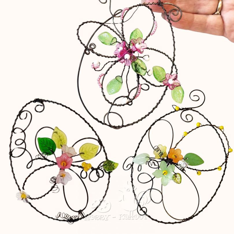 Drátované ozdoby - vajíčka z černého drátu zdobené kytičkami. Určeno pro začátečníky a mírně pokročilé. Mohou se zúčastnit i velké šikovné děti od 11 let.