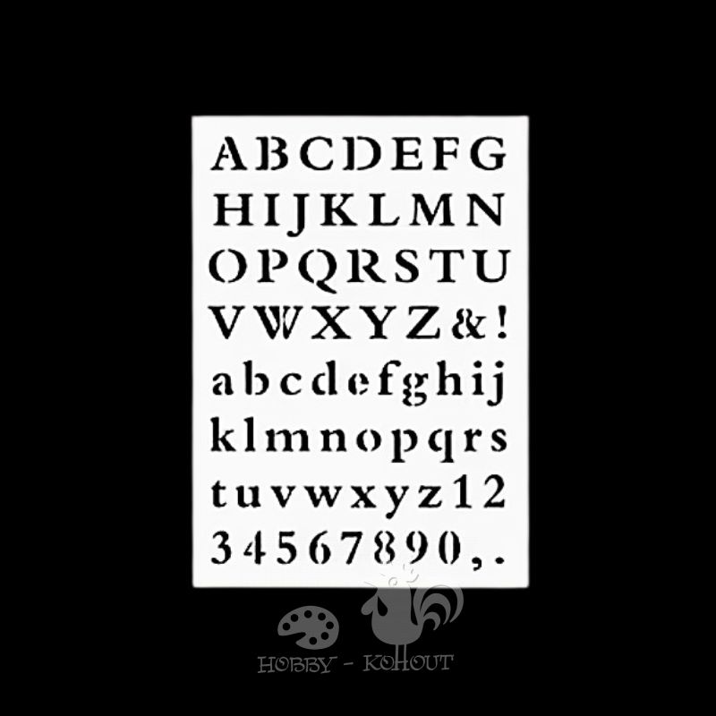 Šablona na textil a malování, celá abeceda velkých písmen + číslice. Celková velikost plastové šablony 17,5 x 12,5 cm, výška písma cca. 1,2 a 0,8 cm. Vhodné pro práci s textilními barvami a akrylovými barvami. Barvy nanášejte houbičkou nebo tupovacím štětcem, k fixaci šablony můžete použít po obvodu malířskou lepenku, ulehčí vám to práci. Šablony po použití opatrně očistit a omýt, než barva zcela zaschne. Před dalším použitím osušit, aby nedošlo k rozpíjení barev při následném malování.