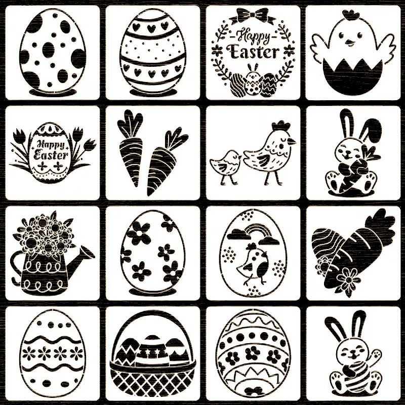 Šablony na malování Velikonoce sada 16 různých motivů na všestranné použití. Velikost plastové šablony 10x10 cm. Vhodné na malování obličejovými barvami, textilními nebo akrylovými barvami a popisovači. Šablony jsou z pevného plastu a jsou opakovaně použitelné. Barvy nanášejte houbičkou nebo tupovacím štětcem, k fixaci šablony na látku můžete použít po obvodu malířskou lepenku, ulehčí vám to práci. Šablony po použití opatrně očistit a omýt, než barva zcela zaschne. Před dalším použitím osušit, aby nedošlo k rozpíjení barev při následném malování.