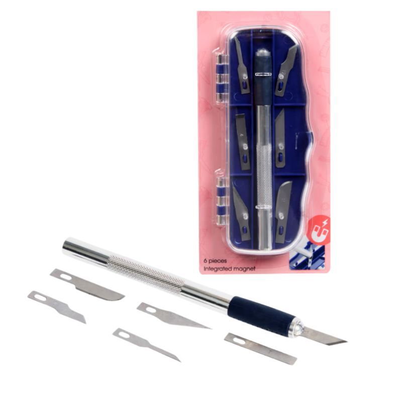 Skalpelový řezák, ostrý nůž včetně 6 ks výměnných a náhradních čepelí v plastovém pouzdře. Vhodný pro řezání plastových šablon, papíru, folií, mechové gumy a pod. Skalpel má protiskluzovou rukojeť, délka 12,5 cm se šroubovací hlavicí pro výměnu břitů.