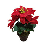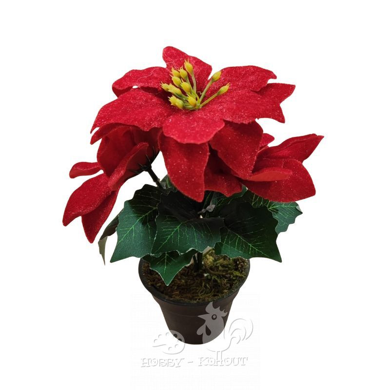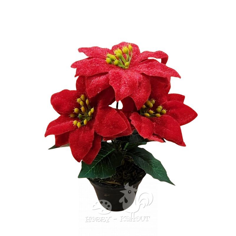Pugét sametových květů zasazený v květníku, 3x květ vánoční růže o průměru cca. 10 cm, celková výška dekorace cca. 20 cm. Dekorace na vánoční výzdobu širšího použití.