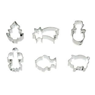 Mini vykrajovátka kovová sada 6 ks, velikost 1,5 - 2,5 cm. Vhodné na zdobení svíček voskovými plátky, modelovací hmoty a fimo, vánoční motivy - andílek, stromeček, ryba, kometa, sněhulák, prasátko. Zboží není zařazeno ve VO sekci.